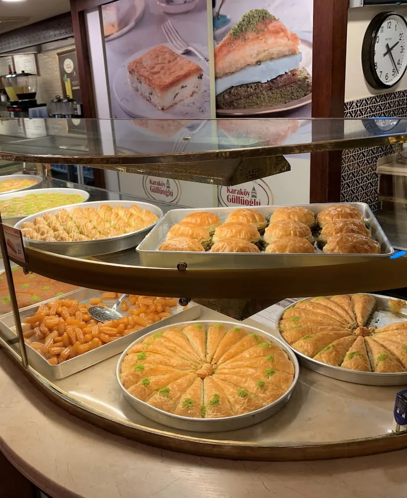 🍞 Para todos los gustos: Más allá de las visitas turísticas, Karaköy es un barrio increíble para comer y beber a su manera a través de la increíble escena culinaria de Turquía. Para disfrutar del mejor desayuno turco a base de quesos, aceitunas, huevos y pan recién horneado, dirígete a Karaköy Güllüoğlu. Esta histórica panadería, que data de 1949, es una leyenda local, con una acogedora cafetería en el piso de arriba.